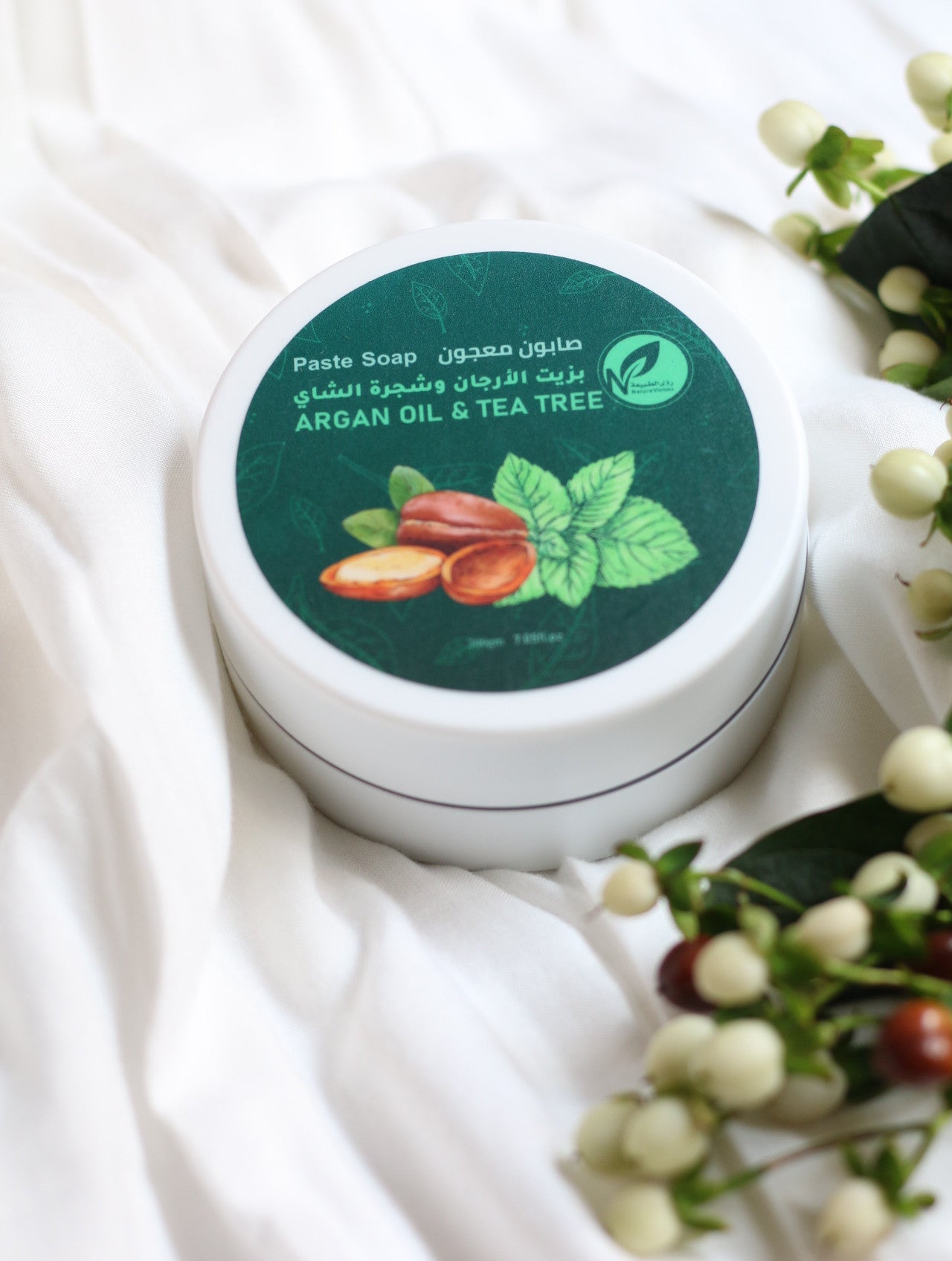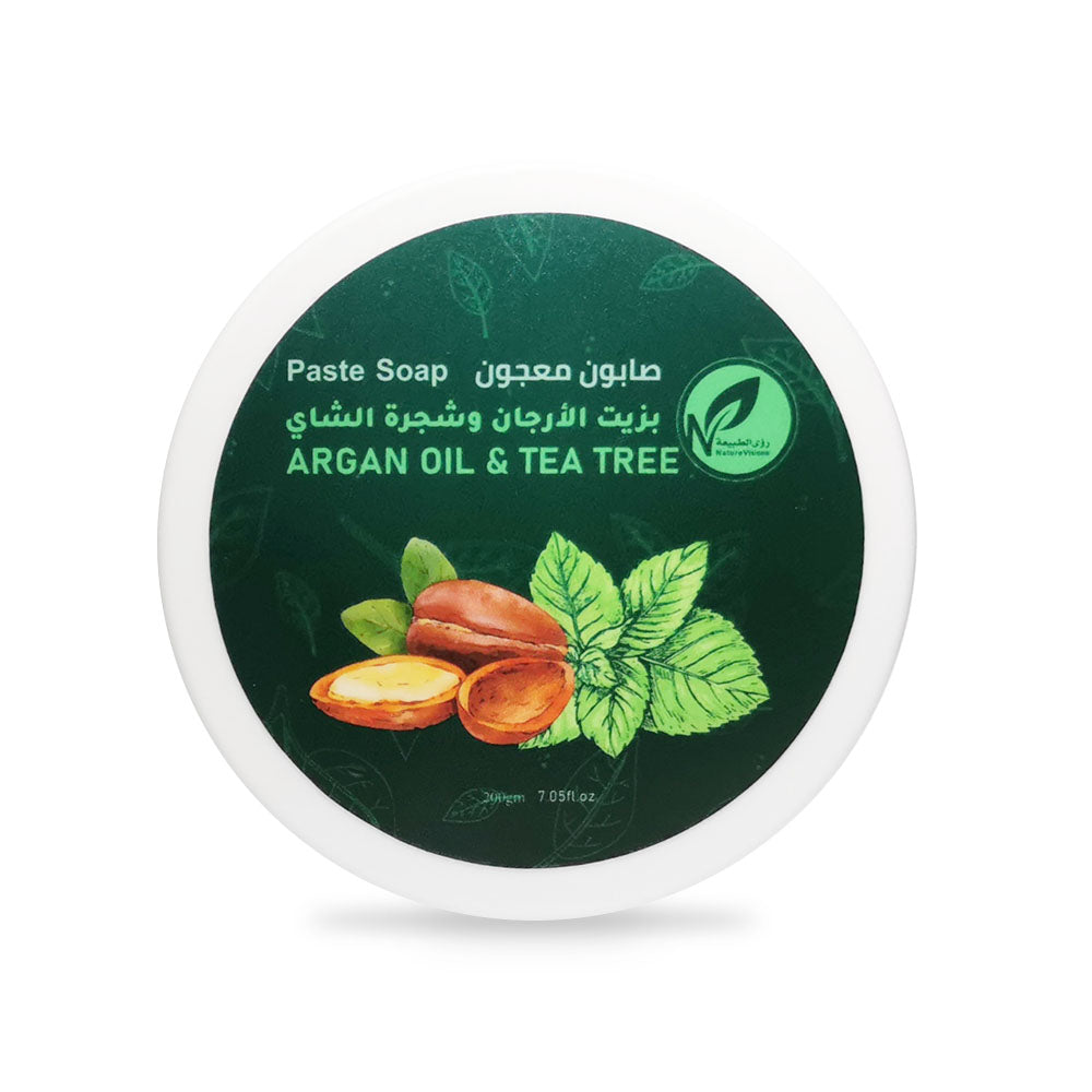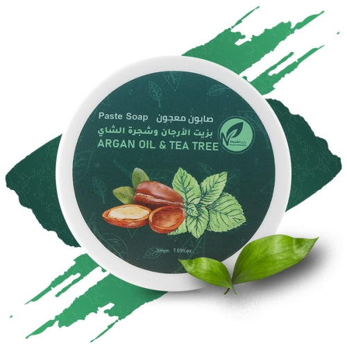 صابون معجون بزيت الأرجان و شجرة الشاي هو أفضل بديل للصابون العادي الصناعي وخاصة المعطر بالعطور التي تعمل على اسمرار البشرة، إنه صابون طبيعي وخالي من مواد التنظيف الكيميائية الضارة.